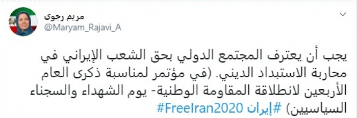 وقالت في تغريدة عبر "تويتر" رصدها "المشهد العربي": "يجب أن يعترف المجتمع الدولي بحق الشعب الإيراني في محاربة الاستبداد الديني. (في مؤتمر لمناسبة ذكرى العام الأربعين لانطلاقة المقاومة الوطنية- يوم الشهداء والسجناء السياسيين)".