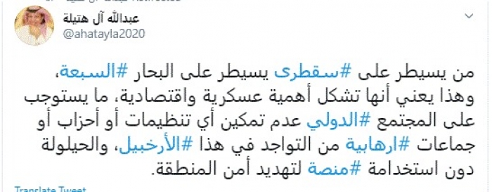 طالب الكاتب السعودي عبدالله آل هتيلة، اليوم، المجتمع الدولي بعدم تمكين أي أحزاب إرهابية – في إشارة لجماعة الإخوان الإرهابية باليمن- من التواجد في سقطرى.
