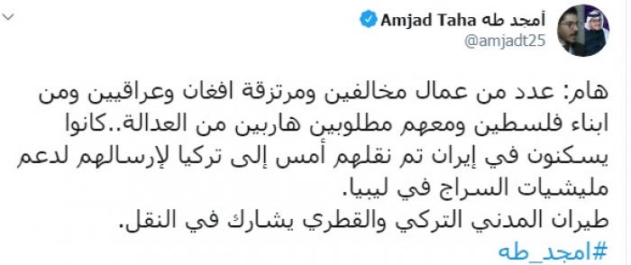 وكتب عبر تغريدة له على "تويتر" رصدها " المشهد العربي": "هام، عدد من عمال مخالفين ومرتزقة أفغان وعراقيين ومن أبناء فلسطين ومعهم مطلوبين هاربين من العدالة، كانوا يسكنون في إيران تم نقلهم أمس إلى تركيا لإرسالهم لدعم مليشيات السراج في ليبيا".