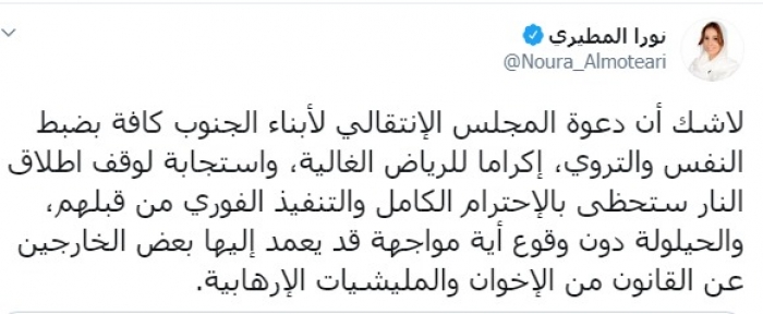وكتبت عبر تغريدة لها على "تويتر" رصدها "المشهد العربي": "لاشك أن دعوة المجلس الانتقالي لأبناء الجنوب كافة بضبط النفس والتروي، إكراما للرياض الغالية، واستجابة لوقف إطلاق النار ستحظى بالاحترام الكامل والتنفيذ الفوري من قبلهم، والحيلولة دون وقوع أية مواجهة قد يعمد إليها بعض الخارجين عن القانون من الإخوان والمليشيات الإرهابية".