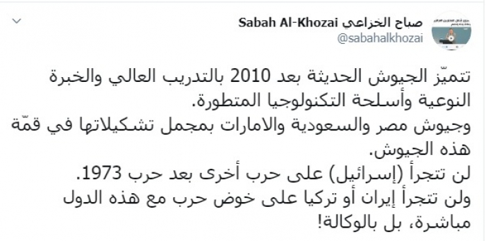 وكتب عبر تغريدة له على "تويتر" رصدها " المشهد العربي":"تتميّز الجيوش الحديثة بعد 2010 بالتدريب العالي والخبرة النوعية وأسلحة التكنولوجيا المتطورة، وجيوش مصر والسعودية والإمارات بمجمل تشكيلاتها في قمّة هذه الجيوش".