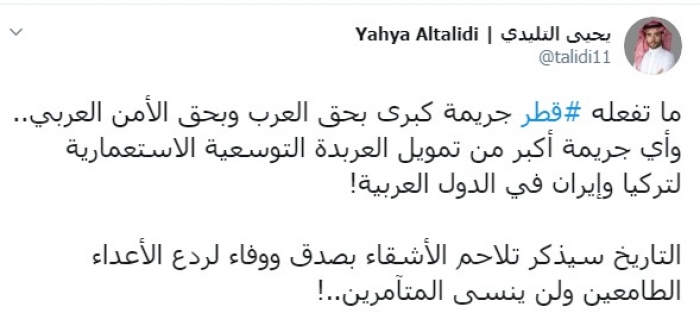 وكتب عبر تغريدة له على "تويتر" رصدها " المشهد العربي": "ما تفعله قطر جريمة كبرى بحق العرب وبحق الأمن العربي، وأي جريمة أكبر من تمويل العربدة التوسعية الاستعمارية لتركيا وإيران في الدول العربية".