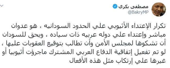 وكتب عبر تغريدة له على "تويتر" رصدها " المشهد العربي":"تكرار الاعتداء الإثيوبي علي الحدود السودانية، هو عدوان مباشر واعتداء علي دوله عربية ذات سيادة ، ويحق للسودان أن تشكوها لمجلس الأمن وأن تطالب بتوقيع العقوبات عليها، لو تم تفعيل اتفاقية الدفاع العربي المشترك ما جرؤت أثيوبيا أو غيرها علي ارتكاب مثل هذه الأفعال".