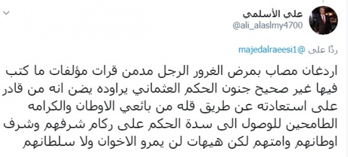 شن الناشط السياسي علي الأسلمي، اليوم، هجوما عنيفا على الرئيس التركي رجب طيب أردوغان.