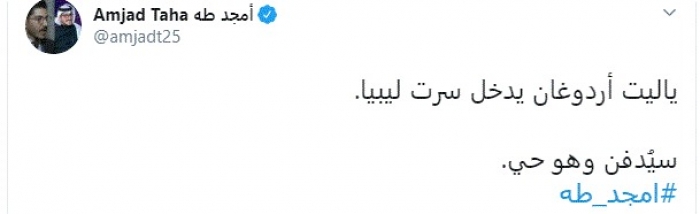 وقال في تغريدة عبر "تويتر" رصدها "المشهد العربي": "ياليت أردوغان يدخل سرت ليبيا. سيُدفن وهو حي".