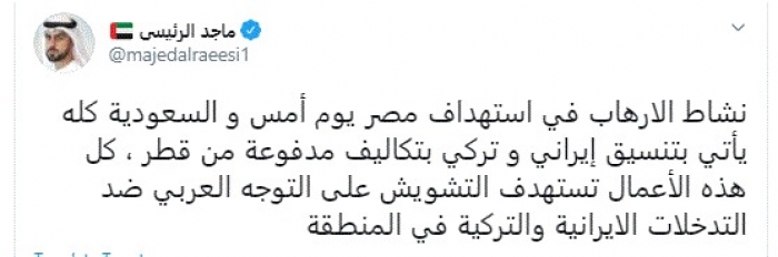 وقال في تغريدة عبر "تويتر" رصدها "المشهد العربي": "نشاط الإرهاب في استهداف مصر يوم أمس والسعودية كله يأتي بتنسيق إيراني و تركي بتكاليف مدفوعة من قطر".
