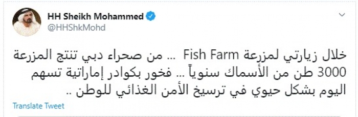 وقال في تغريدة عبر "تويتر" رصدها "المشهد العربي": "خلال زيارتي لمزرعة Fish Farm من صحراء دبي تنتج المزرعة 3000 طن من الأسماك سنوياً. فخور بكوادر إماراتية تسهم اليوم بشكل حيوي في ترسيخ الأمن الغذائي للوطن".