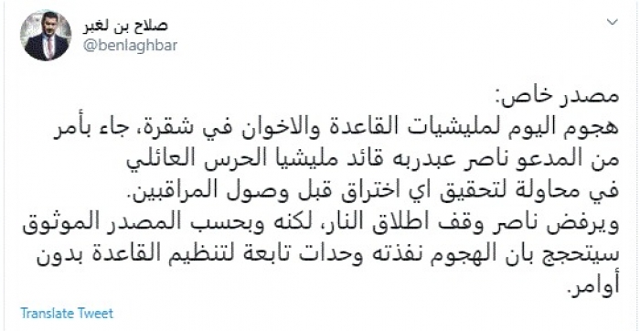 وكتب في تغريدة عبر "تويتر" رصدها "المشهد العربي": "مصدر خاص: هجوم اليوم لمليشيات القاعدة والاخوان في شقرة، جاء بأمر من المدعو ناصر عبدربه قائد مليشيا الحرس العائلي في محاولة لتحقيق اي اختراق قبل وصول المراقبين".