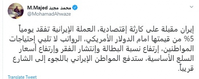 وكتب في تغريدة عبر "تويتر" رصدها "المشهد العربي": "إيران مقبلة على كارثة إقتصادية، العملة الإيرانية تفقد يومياً 5% من قيمتها امام الدولار الأمريكي، الرواتب لا تلبي إحتياجات المواطنين".