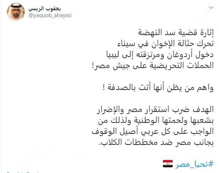 وأضاف: "الهدف ضرب استقرار مصر والإضرار بشعبها ولحمتها الوطنية ولذلك من الواجب على كل عربي أصيل الوقوف بجانب مصر ضد مخططات .....".