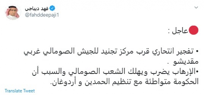 وكتب في تغريدة عبر "تويتر" رصدها "المشهد العربي": "تفجير انتحاري قرب مركز تجنيد للجيش الصومالي غربي مقديشيو. الإرهاب يضرب ويهلك الشعب الصومالي والسبب أن الحكومة متواطئة مع تنظيم الحمدين و أردوغان".