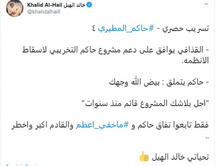وقال في تغريدة عبر "تويتر" رصدها "المشهد العربي": "تسريب حصري – حاكم المطيري ٤. القذافي يوافق على دعم مشروع حاكم التخريبي لإسقاط الأنظمة. حاكم يتملق: بيض الله وجهك أجل بلا شك المشروع قائم منذ سنوات".
