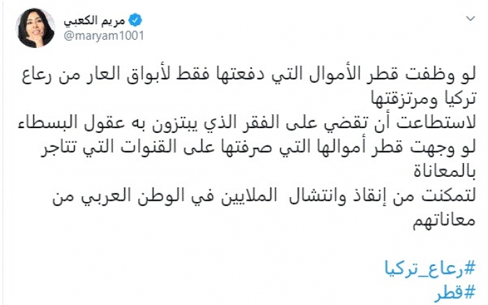 شنت الكاتبة والإعلامية الإماراتية مريم الكعبي، اليوم، هجومًا حادًا على النظام القطري جراء تمويلها لأبواق جماعة الإخوان ومرتزقتها.