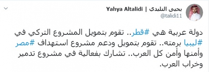وكتب عبر تغريدة له على "تويتر" رصدها " المشهد العربي":"دولة عربية هي قطر، تقوم بتمويل المشروع التركي في ليبيا برمته، تقوم بتمويل ودعم مشروع استهداف مصر وأمنها وأمن كل العرب، تشارك بفعالية في مشروع تدمير وخراب العرب".