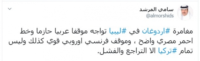 وكتب عبر تغريدة له على "تويتر" رصدها " المشهد العربي":"مغامرة أردوغان في ليبيا تواجه موقفا عربيا حازما وخط أحمر مصري واضح ، وموقف فرنسي أوروبي قوي كذلك، وليس تمام تركيا إلا التراجع والفشل".