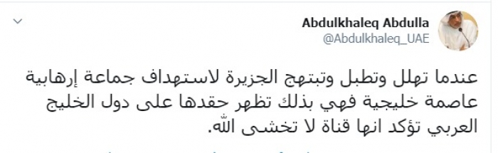 وكتب عبر تغريدة له على "تويتر" رصدها " المشهد العربي":"عندما تهلل وتطبل وتبتهج الجزيرة لاستهداف جماعة إرهابية عاصمة خليجية فهي بذلك تظهر حقدها على دول الخليج العربي تؤكد أنها قناة لا تخشى الله".