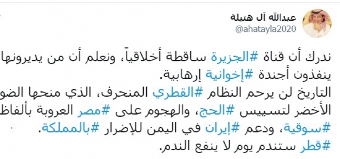 وكتب عبر تغريدة له على "تويتر" رصدها " المشهد العربي": "ندرك أن قناة الجزيرة ساقطة أخلاقيا، ونعلم أن من يديرونها ينفذون أجندة إخوانية إرهابية، التاريخ لن يرحم النظام القطري المنحرف، الذي منحها الضوء الأخضر لتسييس الحج، والهجوم على مصر العروبة بألفاظ سوقية، ودعم إيران في اليمن للإضرار بالمملكة".
