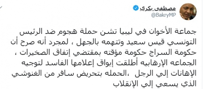 أكد الإعلامي والبرلماني المصري، مصطفى بكري، أن إخوان ليبيا يشنون حملة ضد الرئيس التونس قيس سعيد بتحريض من القيادي الإخواني التونسي راشد الغنوشي.