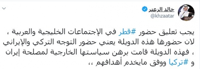 طالب المحلل السياسي السعودي خالد الزعتر، اليوم الثلاثاء، بتعليق حضور قطر في الاجتماعات العربية والخليجية.