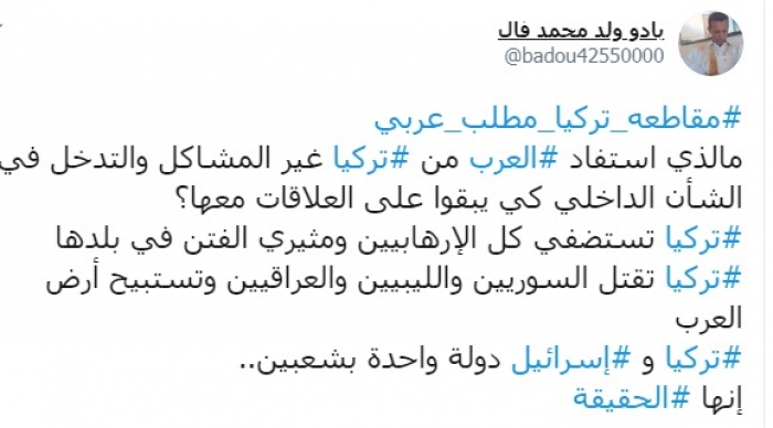 طالب الكاتب الصحفي الموريتاني بادو ولد محمد فال، اليوم الثلاثاء، الدول العربية بقطع العلاقات مع تركيا.