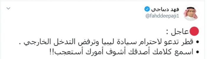 وكتب عبر تغريدة له على "تويتر" رصدها " المشهد العربي":" عاجل، قطر تدعو لاحترام سيادة ليبيا وترفض التدخل الخارجي، اسمع كلامك أصدقك أشوف أمورك استعجب".