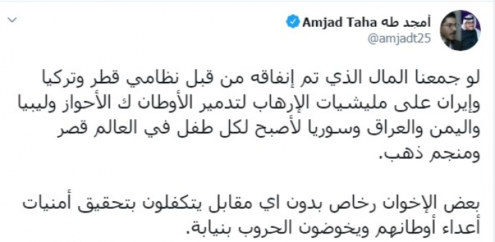 وكتب عبر تغريدة له على " تويتر" رصدها " المشهد العربي":"لو جمعنا المال الذي تم إنفاقه من قبل نظامي قطر وتركيا وإيران على مليشيات الإرهاب لتدمير الأوطان كالأحواز وليبيا واليمن والعراق وسوريا لأصبح لكل طفل في العالم قصر ومنجم ذهب".