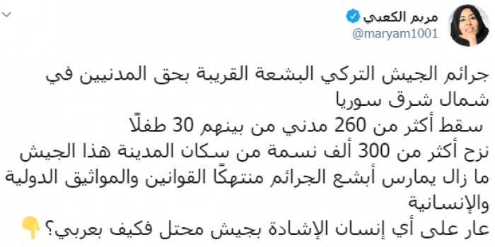 أكدت الكاتبة والإعلامية مريم الكعبي، اليوم الأربعاء، أن الجيش التركي ارتكب جرائم بشعة بحق المدنيين في شمال شرق سوريا.