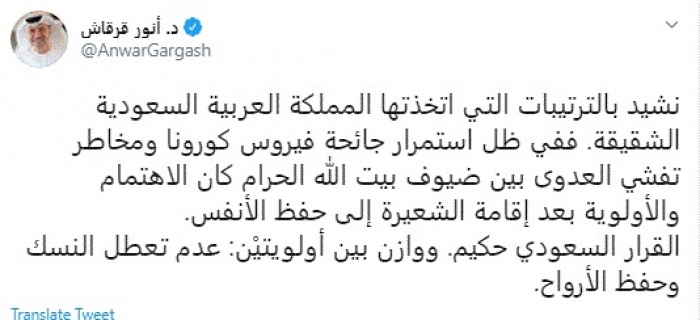 وأضاف: "القرار السعودي حكيم. ووازن بين أولويتيْن: عدم تعطل النسك وحفظ الأرواح".
