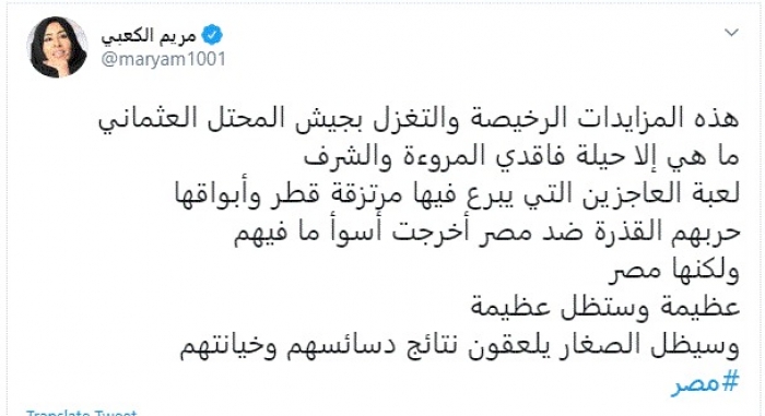 انتقدت الإعلامية الإماراتية مريم الكعبي، اليوم، إشادات أبواق قطر والإخوان بالجيش التركي، مؤكدةً أن تلك الأفعال لعبة عاجزة في حربهم ضد مصر.