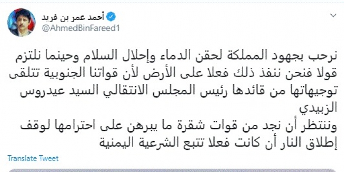 رحب رئيس دائرة العلاقات الخارجية للمجلس الانتقالي الجنوبي في أوروبا، أحمد عمر بن فريد، اليوم، بجهود المملكة العربية السعودية في إحلال السلام.