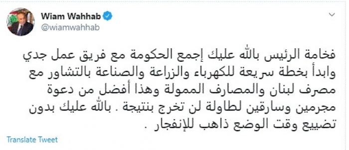 وقال في تغريدة عبر "تويتر" رصدها "المشهد العربي": "فخامة الرئيس بالله عليك إجمع الحكومة مع فريق عمل جدي وابدأ بخطة سريعة للكهرباء والزراعة والصناعة بالتشاور مع مصرف لبنان والمصارف الممولة وهذا أفضل من دعوة مجرمين وسارقين لطاولة لن تخرج بنتيجة".
