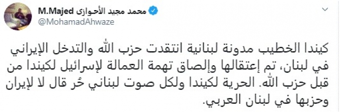 وقال في تغريدة عبر "تويتر" رصدها "المشهد العربي": "كيندا الخطيب مدونة لبنانية انتقدت حزب الله والتدخل الإيراني في لبنان، تم إعتقالها وإلصاق تهمة العمالة لإسرائيل لكيندا من قبل حزب الله. الحرية لكيندا ولكل صوت لبناني حُر قال لا لإيران وحزبها في لبنان العربي".