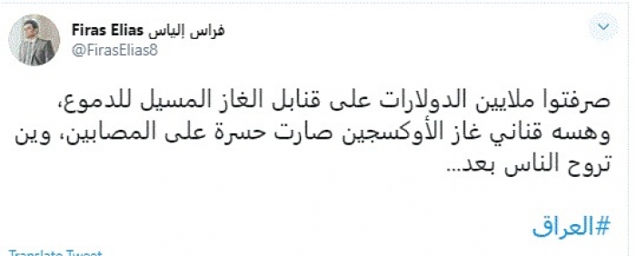 وقال في تغريدة عبر "تويتر" رصدها "المشهد العربي": "صرفتوا ملايين الدولارات على قنابل الغاز المسيل للدموع، وهسه قناني غاز الأوكسجين صارت حسرة على المصابين، وين تروح الناس بعد".