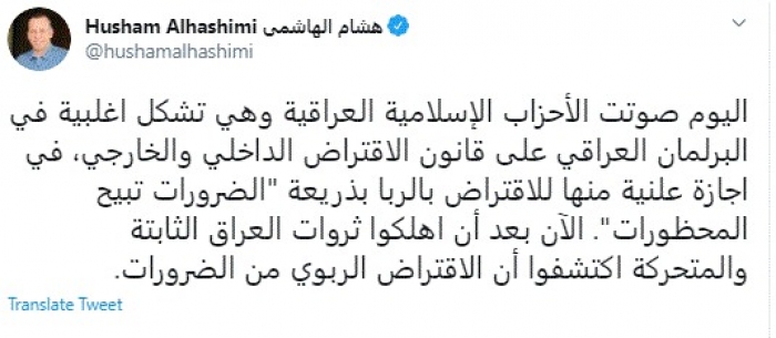 وقال في تغريدة عبر "تويتر" رصدها "المشهد العربي": "اليوم صوتت الأحزاب الإسلامية العراقية وهي تشكل اغلبية في البرلمان العراقي على قانون الاقتراض الداخلي والخارجي، في إجازة علنية منها للاقتراض بالربا بذريعة "لضرورات تبيح المحظورات".