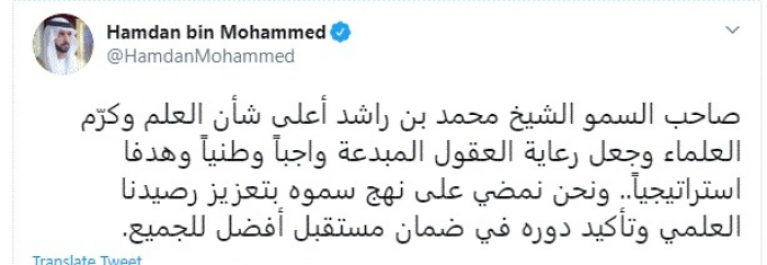 وكتب في تغريدة عبر "تويتر" رصدها "المشهد العربي": "صاحب السمو الشيخ محمد بن راشد أعلى شأن العلم وكرّم العلماء وجعل رعاية العقول المبدعة واجباً وطنياً وهدفا استراتيجياً.. ونحن نمضي على نهج سموه بتعزيز رصيدنا العلمي وتأكيد دوره في ضمان مستقبل أفضل للجميع".