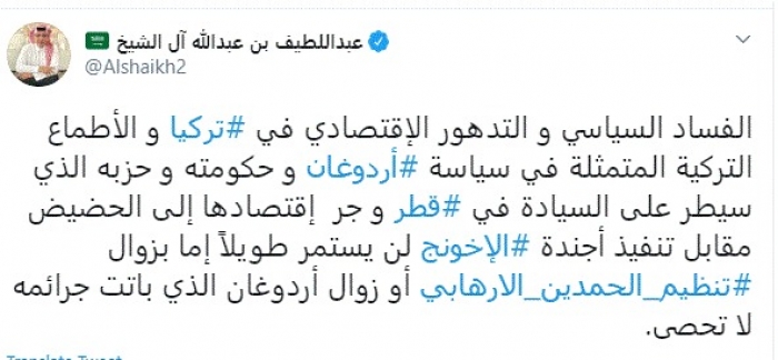 توقع الكاتب السعودي عبداللطيف آل الشيخ، اليوم، سقوط نظام الرئيس التركي رجب طيب أردوغان وتنظيم الحمدين في قطر.