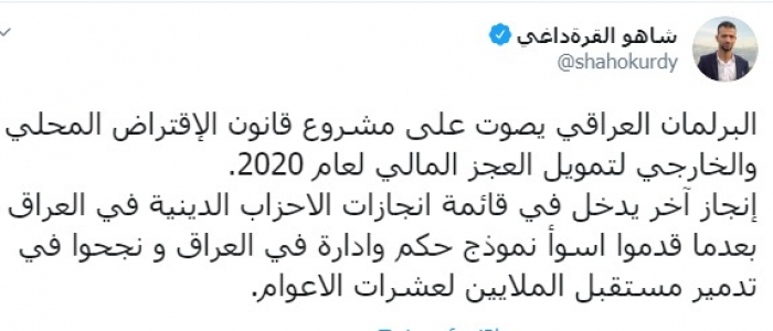 وكتب عبر تغريدة له على "تويتر" رصدها " المشهد العربي": "البرلمان العراقي يصوت على مشروع قانون الاقتراض المحلي والخارجي لتمويل العجز المالي لعام 2020".
