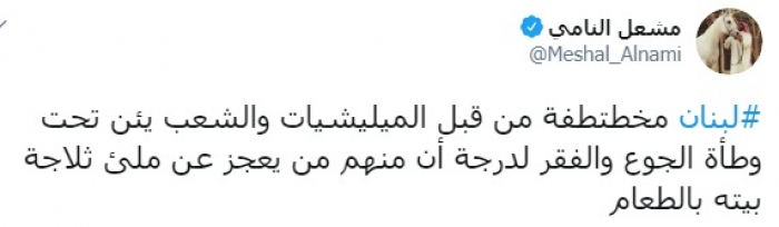 وكتب عبر تغريدة له على "تويتر" رصدها " المشهد العربي": "لبنان مختطف من قبل المليشيات والشعب يئن تحت وطأة الجوع والفقر لدرجة أن منهم من يعجز عن مليء ثلاجة بيته بالطعام".