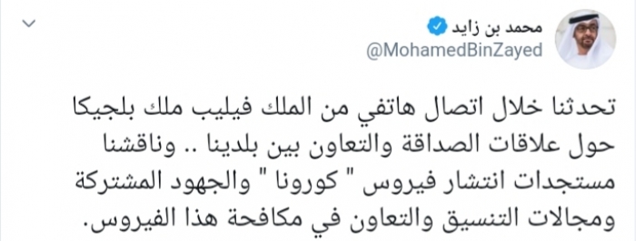 ناقش ولي عهد أبوظبي نائب القائد الأعلى للقوات المسلحة الإماراتية الشيخ محمد بن زايد آل نهيان، اليوم الأربعاء، مع ملك بلجيكا التعاون المشترك في مكافحة فيروس كورونا.