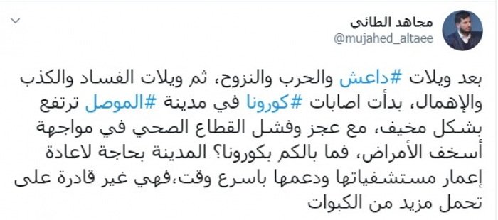 وكتب عبر تغريدة له على "تويتر" رصدها " المشهد العربي": "بعد ويلات داعش والحرب والنزوح، ثم ويلات الفساد والكذب والإهمال، بدأت إصابات كورونا في مدينة الموصل ترتفع بشكل مخيف، مع عجز وفشل القطاع الصحي في مواجهة أسخف الأمراض، فما بالكم بكورونا؟".