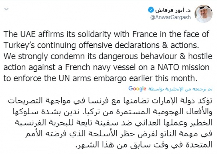 وكتب وزير الدولة الإماراتي للشؤون الخارجية الدكتور أنور قرقاش، عبر تغريدة له على "تويتر" رصدها "المشهد العربي" :"تؤكد دولة الإمارات تضامنها مع فرنسا في مواجهة التصريحات والأفعال الهجومية المستمرة من تركيا.