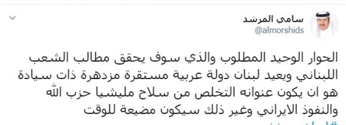 وكتب عبر تغريدة له على "تويتر" رصدها " المشهد العربي":"الحوار الوحيد المطلوب والذي سوف يحقق مطالب الشعب اللبناني ويعيد لبنان دولة عربية مستقرة مزدهرة ذات سيادة هو أن يكون عنوانه التخلص من سلاح مليشيا حزب الله والنفوذ الإيراني وغير ذلك سيكون مضيعة للوقت".