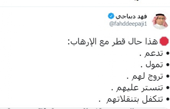 هاجم المحلل السياسي السعودي فهد ديباجي، اليوم الأربعاء، قطر، مؤكدا أنها تدعم وتمول وتروج للإرهاب.