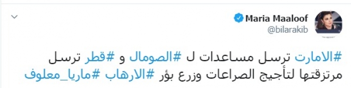 أكدت الإعلامية اللبنانية، ماريا معلوف، اليوم الأربعاء، أنه بينما ترسل الإمارات المساعدات الإنسانية للصومال تزرع قطر الإرهاب بها.