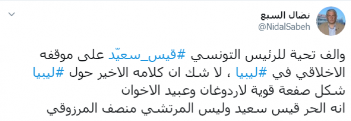 أشاد المحلل السياسي اللبناني نضال السبع، اليوم الخميس، بتصريحات الرئيس التونسي الأخيرة حول ليبيا، مؤكدا أنها شكت صفعة قوية لأردوغان.