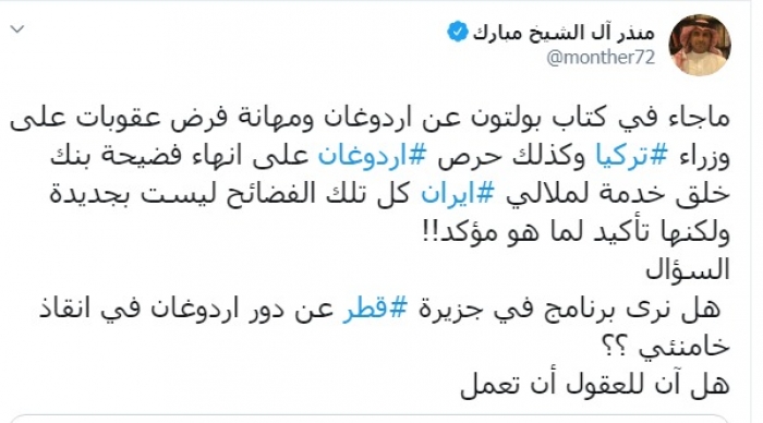 وكتب عبر تغريدة له على "تويتر" رصدها " المشهد العربي": "ماجاء في كتاب بولتون عن أردوغان ومهانة فرض عقوبات على وزراء تركيا وكذلك حرص أردوغان على انهاء فضيحة بنك خلق خدمة لملالي إيران كل تلك الفضائح ليست بجديدة ولكنها تأكيد لما هو مؤكد".