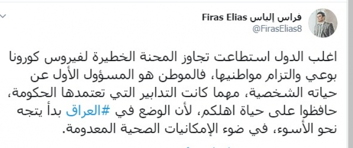 وكتب عبر تغريدة له على "تويتر" رصدها " المشهد العربي":"أغلب الدول استطاعت تجاوز المحنة الخطيرة لفيروس كورونا بوعي والتزام مواطنيها، فالموطن هو المسؤول الأول عن حياته الشخصية، مهما كانت التدابير التي تعتمدها الحكومة، حافظوا على حياة أهلكم، لأن الوضع في العراق بدأ يتجه نحو الأسوأ، في ضوء الإمكانيات الصحية المعدومة".