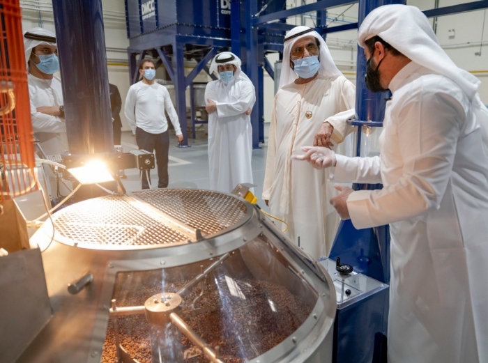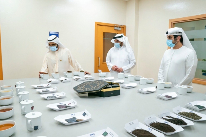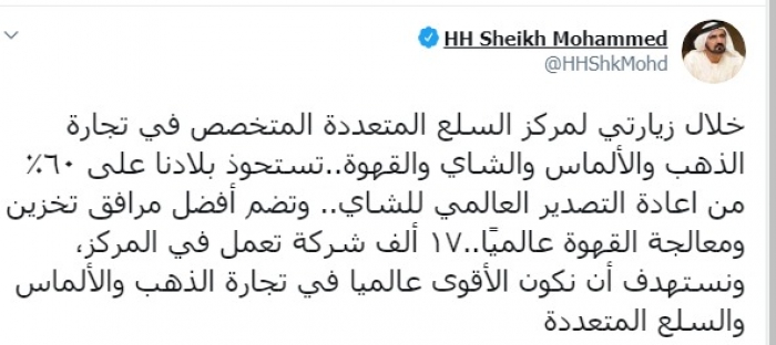 وكتب بن راشد عبر تغريدة له على "تويتر" رصدها " المشهد العربي" ":"خلال زيارتي لمركز السلع المتعددة المتخصص في تجارة الذهب والألماس والشاي والقهوة، تستحوذ بلادنا على ٦٠٪ من إعادة التصدير العالمي للشاي، وتضم أفضل مرافق تخزين ومعالجة القهوة عالميًا".