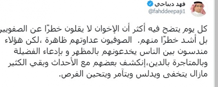 أكد المحلل السياسي السعودي، فهد ديباجي، اليوم الخميس، أن الإخوان هم الأشد خطرا على الوطن العربي".