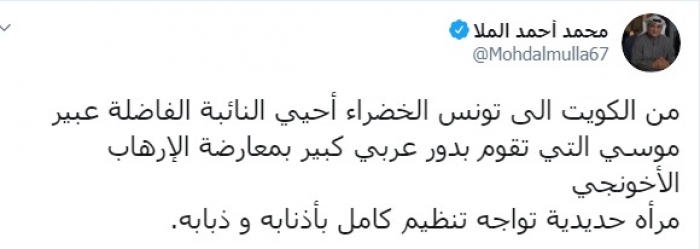 وكتب عبر تغريدة له على "تويتر" رصدها " المشهد العربي":"من الكويت إلى تونس الخضراء أحيي النائبة الفاضلة عبير موسي التي تقوم بدور عربي كبير بمعارضة الإرهاب الإخونجي، مرأة حديدية تواجه تنظيم كامل بأذنابه و ذبابه".